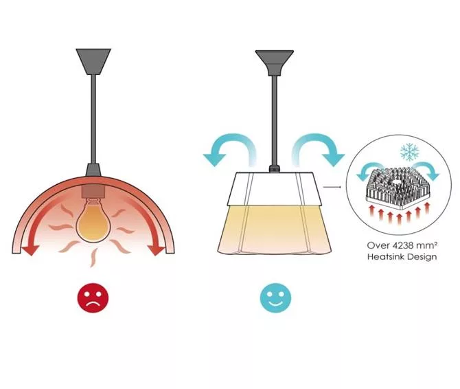 【喜樂】繼承著Xcellent DNA,不惜重本要讓LED涼爽過日子。我們選用高品質的OSRAM LED,並在燈體內暗藏熱源傳導墊讓熱無縫地導向外露的金屬散熱片,高達4238平方毫米 的散熱表面積將熱氣上引至空氣中煙消雲散,喜樂不發高燒才能為您長久效命。