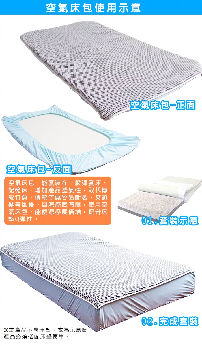 空氣床包,能套裝在一般彈簧床 、記憶床,增加產品透氣性,取代傳統竹蓆,